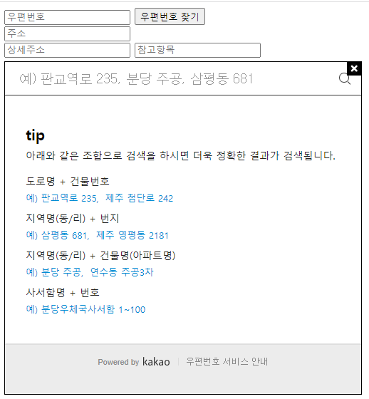 <input type="text" id="sample3_postcode" placeholder="우편번호">