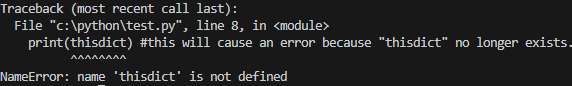 print(thisdict) #this will cause an error because "thisdict" no longer exists.